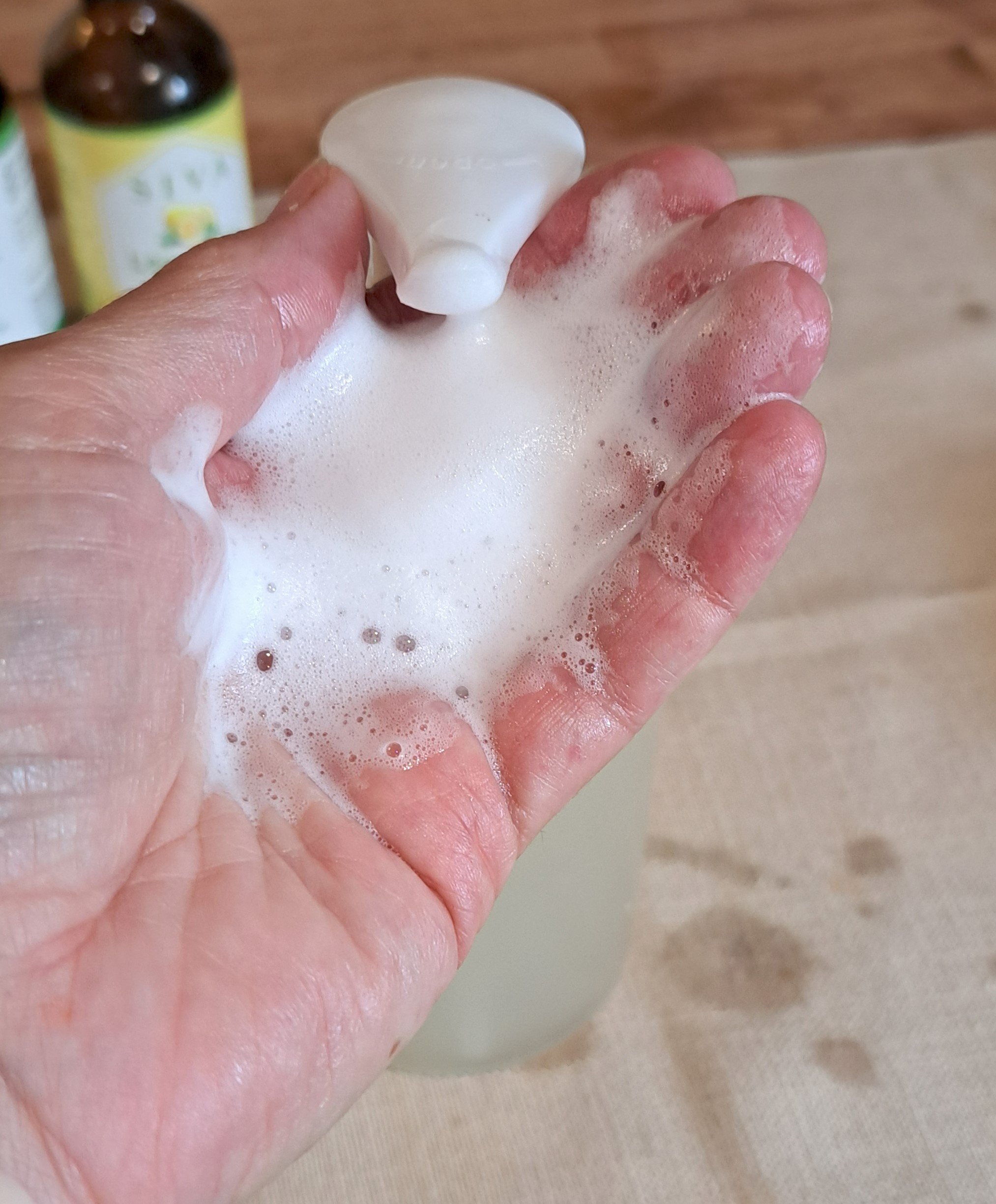 Add the ingredients to a clean foaming soap dispenser. (Tip: reuse an old one or pick up a simple glass version for a rustic touch.)